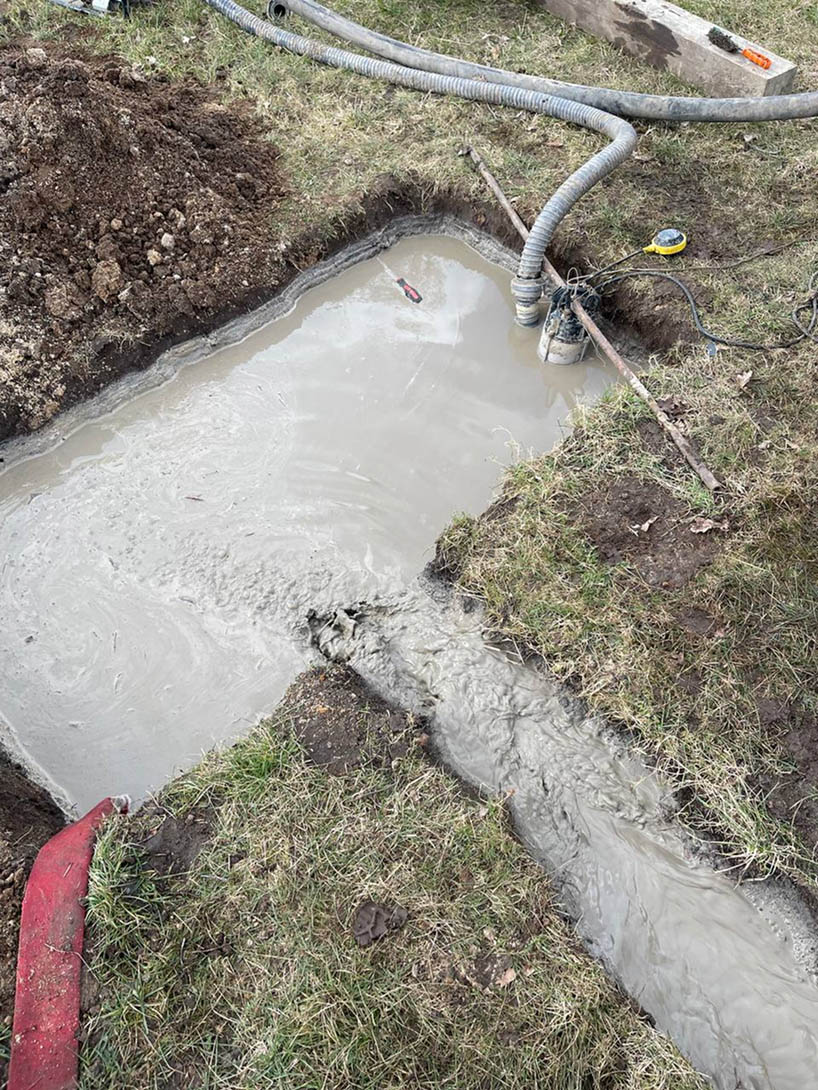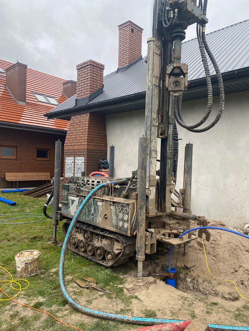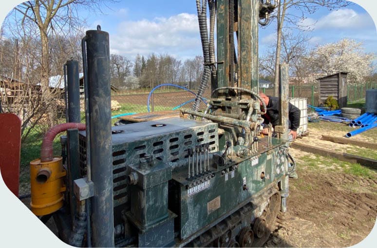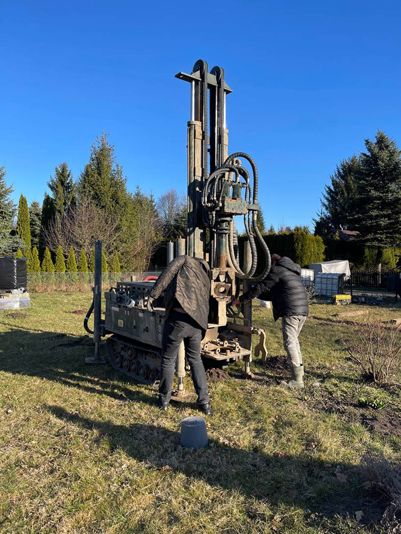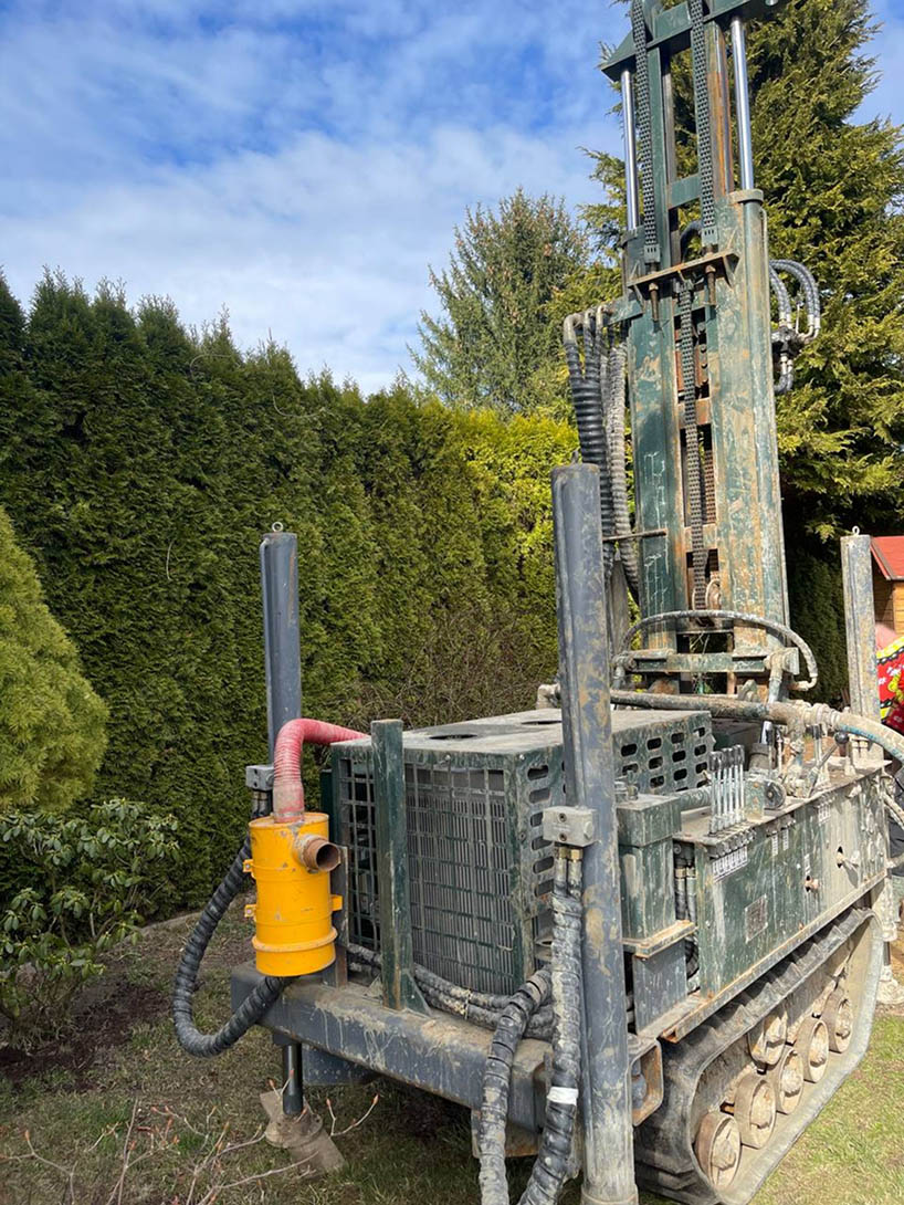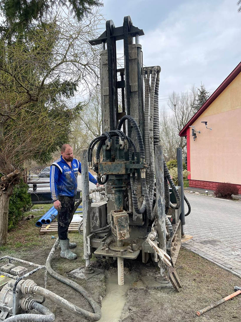 Nasza ekipa musi przygotować sobie miejsce do pracy Między innymi: ustawić i wypoziomować maszynę, wykopać dół płuczkowy, zabezpieczyć teren a także zająć się dostarczeniem wody do miejsca wiercenie. Na wywiercenie 30 metrowej studni potrzebujemy pomiędzy 1000 a 5000 litrów wody. Jak już wszystko mamy - to zaczynamy.